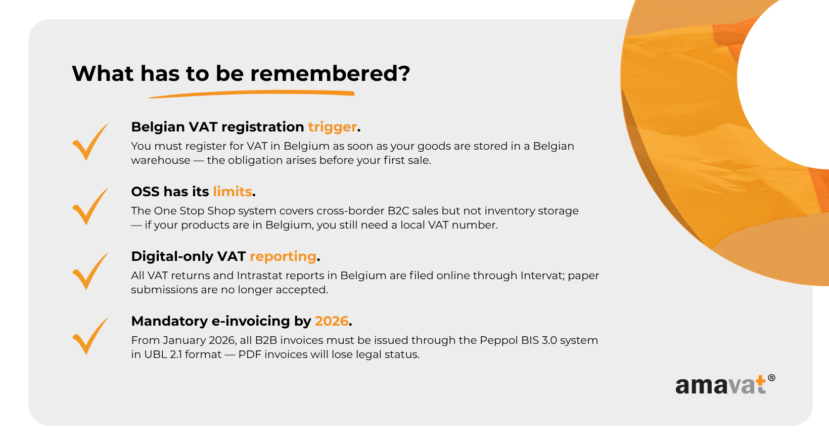 However, if your products are stored in a Belgian Amazon warehouse, local VAT registration becomes mandatory — regardless of whether your company is based in or outside the EU.