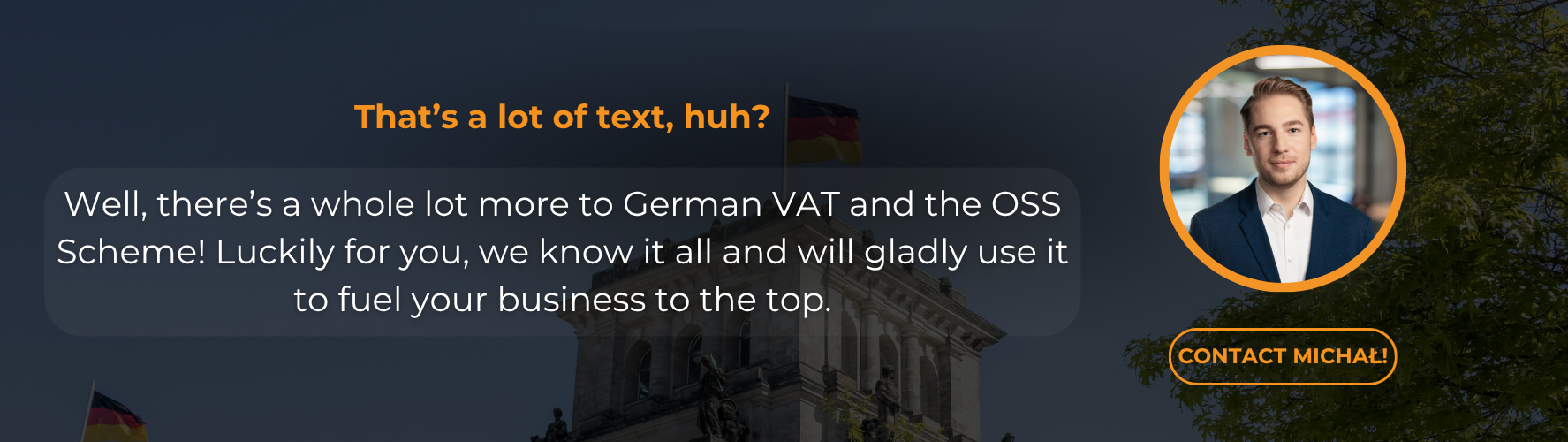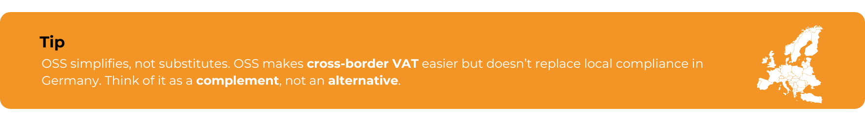 In short, OSS and local VAT registration are complementary, not interchangeable. The first covers shipments between countries, the second covers sales from within the country. Both may apply to your business simultaneously if you store goods in Germany and also ship from another EU country to customers elsewhere.
