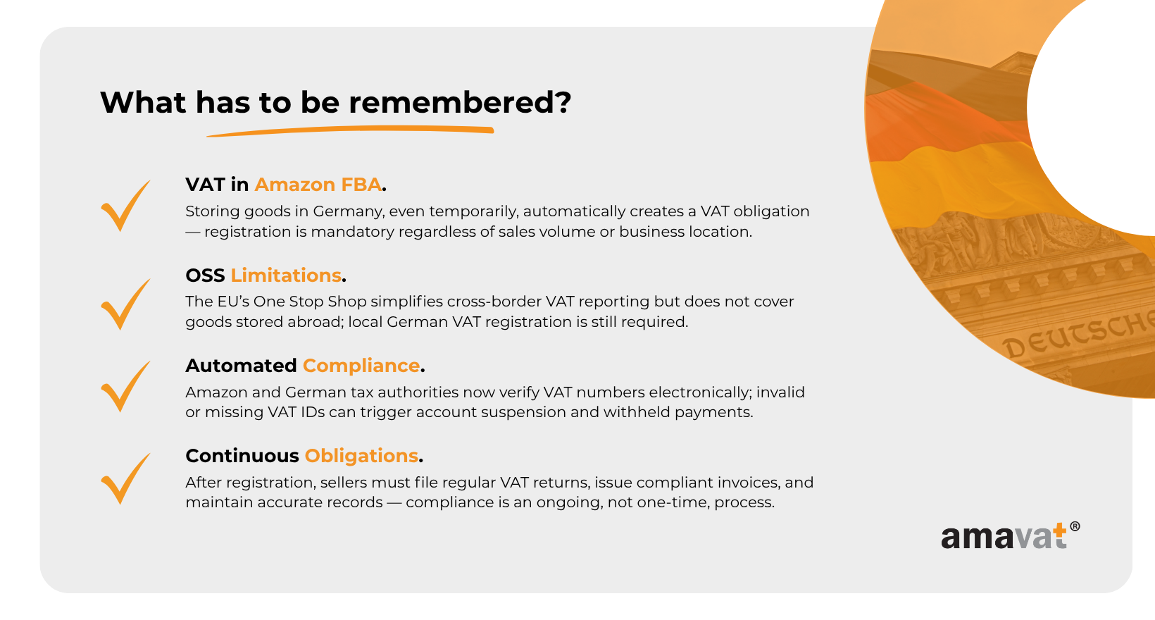 If there is one principle that every Amazon seller should internalize, it is this: OSS simplifies cross-border VAT, but it does not replace national VAT registrations where goods are stored. Once your products are located in Germany, they fall under German VAT law, and compliance with that system is mandatory. OSS is a valuable complement—it can reduce the need for multiple registrations and centralize your cross-border reporting—but it cannot shield you from the obligations arising from local physical presence.