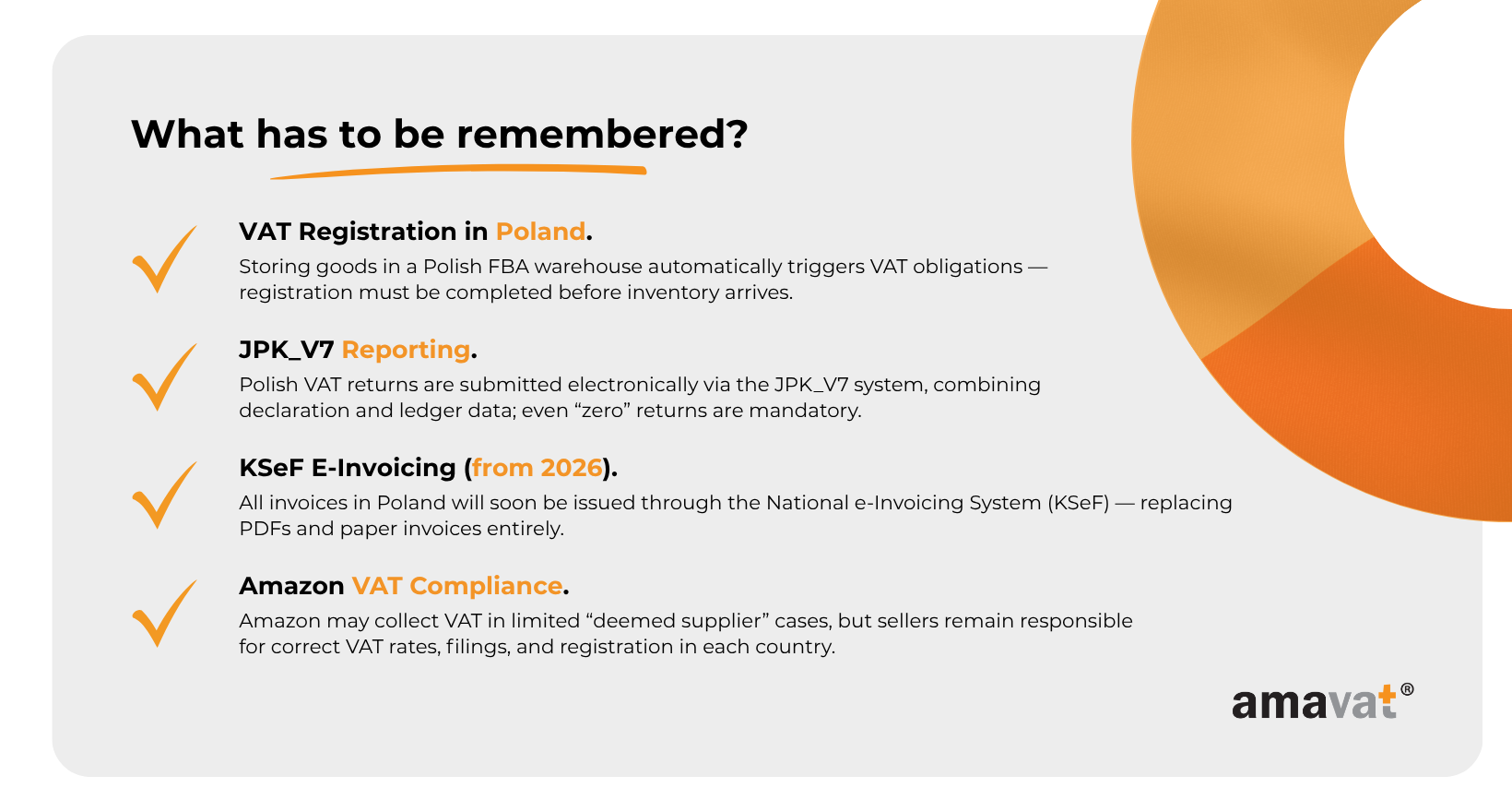 For Amazon FBA sellers, the moment you register for VAT in Poland is a turning point. It marks the line between casual cross-border selling and fully participating in the EU’s tax system. From that point on, all obligations apply — filing VAT returns, submitting JPK_VAT reports, and soon, issuing e-invoices through the KSeF (National e-Invoicing System).