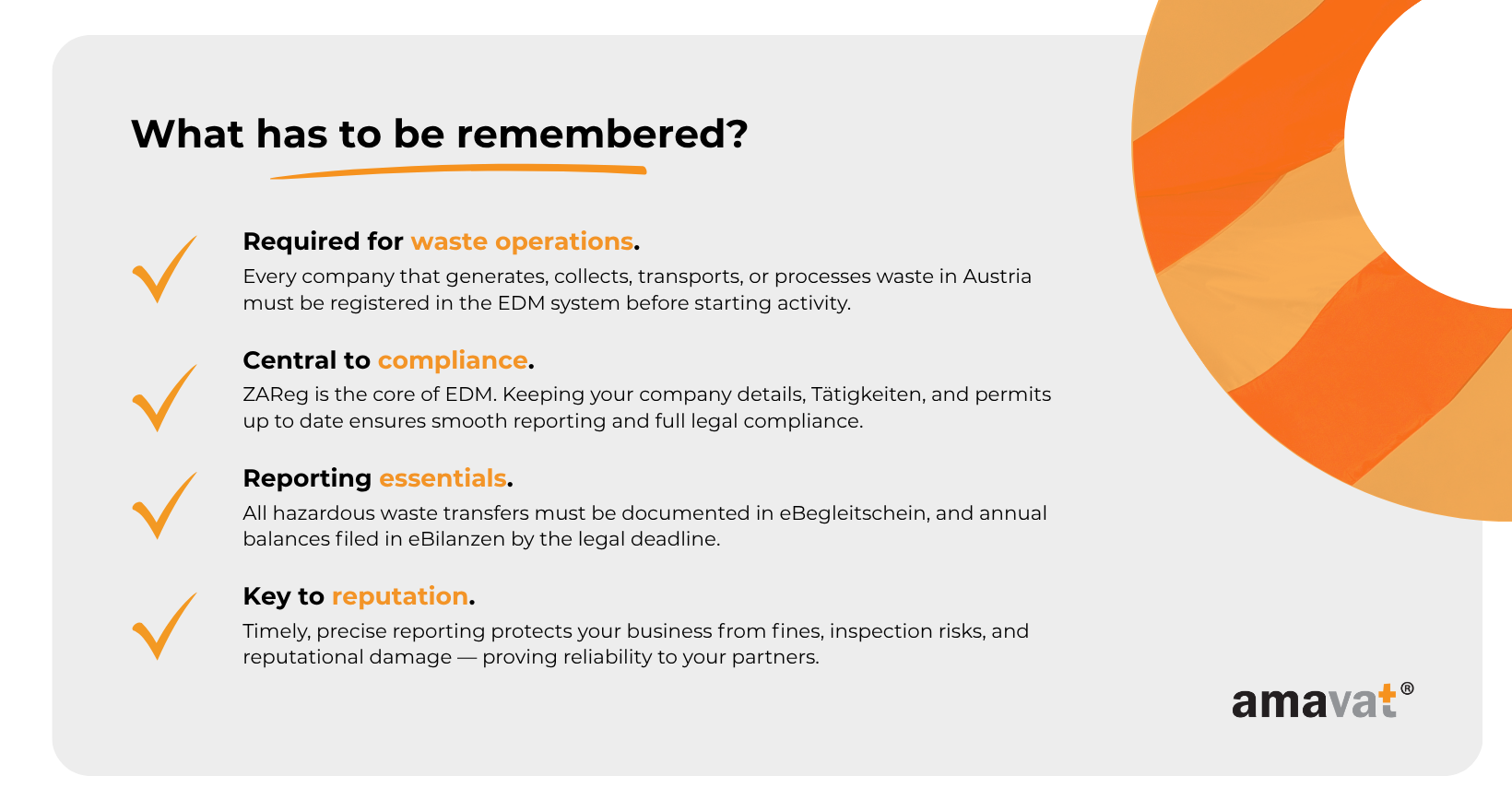 In Austria, punctual compliance with all EDM obligations is far more than a formality. Consistently missing deadlines can trigger financial penalties and lead to heightened scrutiny from supervisory authorities. In more serious cases, the authority may restrict access to specific EDM modules — which, in practice, makes it impossible to continue lawful operations in the waste management sector.