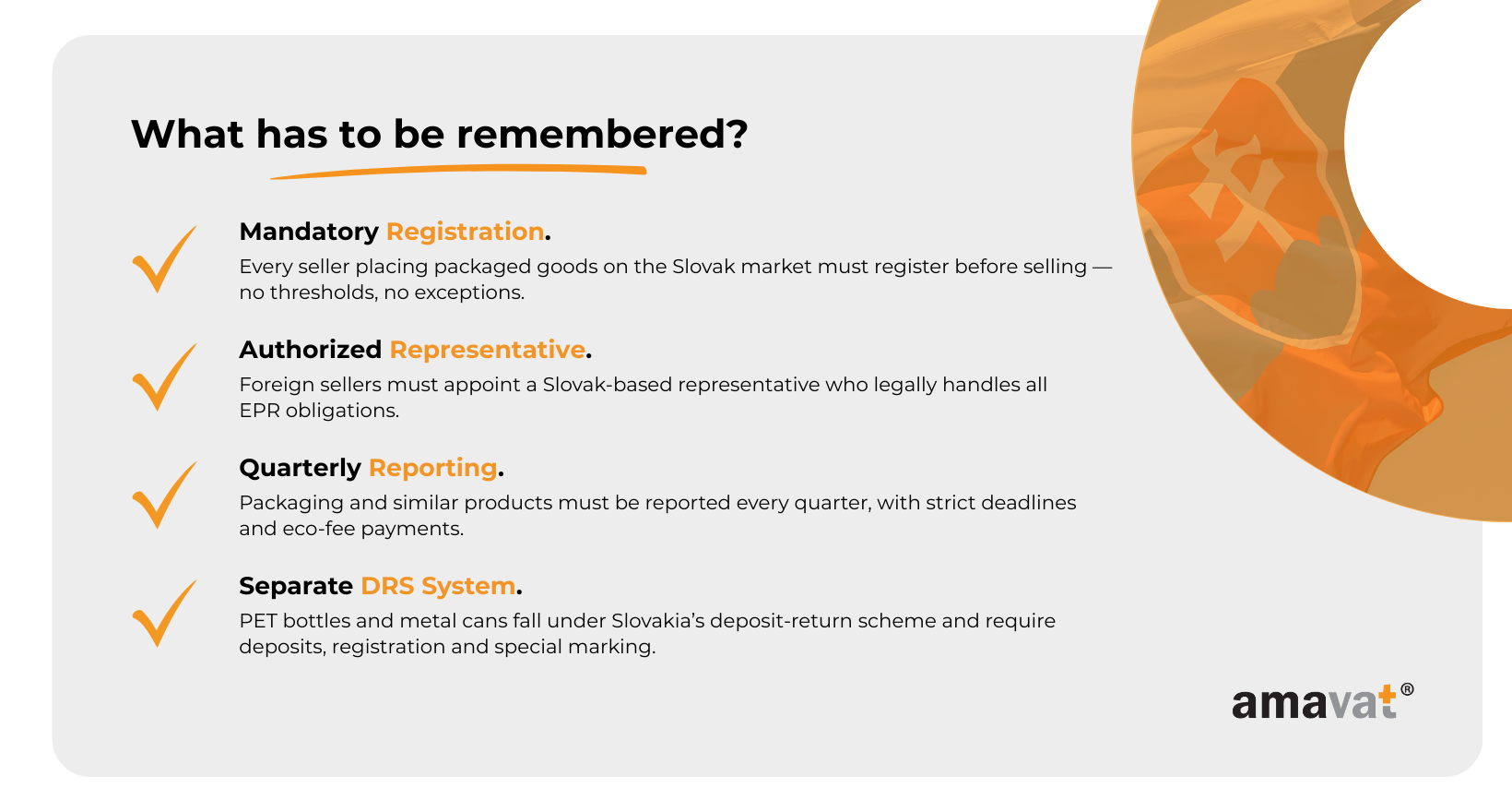 Unlike some EU countries where small businesses get simplified rules or low-volume exemptions, Slovakia has no de minimis threshold for packaging or most other EPR categories. Whether you sell a thousand products a month or ten products a year, you still count as a producer. You still have to register, pay eco-fees and submit reports. If you place anything on the Slovak market that falls under one of the EPR streams, the obligation applies from sale number one.