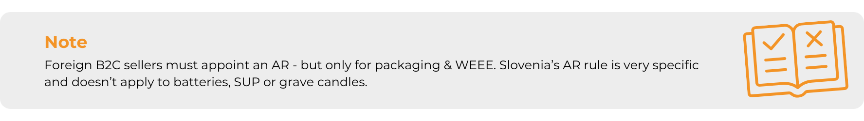 If you are a foreign B2C distance seller — meaning you sell directly to Slovenian consumers from another country — you must appoint a Slovenian Authorized Representative (AR). This requirement applies only to packaging and electrical and electronic equipment (EEE). These are the two categories where the law explicitly states that foreign sellers cannot register on their own.