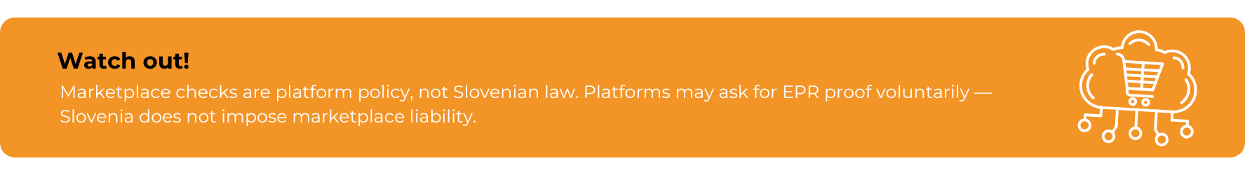 Marketplace pressure is another dimension of enforcement, but it works differently in Slovenia compared to countries like Germany or France. Slovenia does not have a marketplace-liability law that forces platforms to verify producer numbers before allowing sellers to list products. This means Amazon, Etsy or eBay are not legally required to police Slovenian EPR compliance in the way they must for certain other Member States. However, marketplaces increasingly apply EU-wide policies that require sellers to prove they are compliant wherever the marketplace perceives there may be regulatory risk. As a result, some platforms may ask for EPR proof even when the specific country does not impose marketplace duties. When this happens, it is driven by internal platform policy rather than Slovenian legislation, but the practical effect for sellers is similar: if you cannot provide the necessary documents, a marketplace may delay listings or request additional verification before allowing sales to continue.