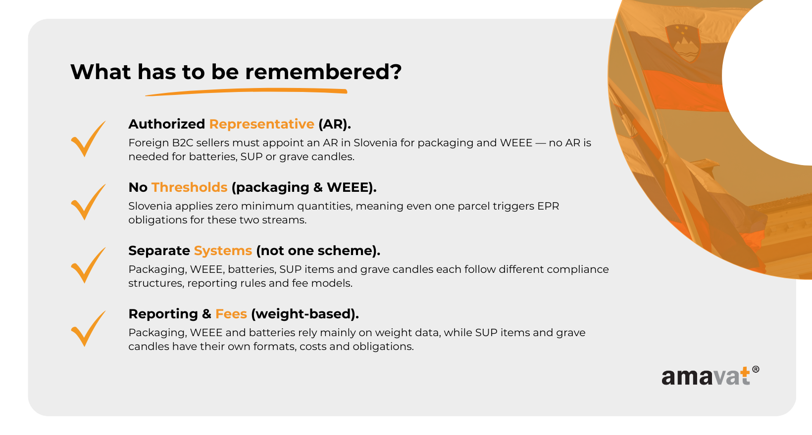 One important nuance: if your business mixes B2B and B2C sales into Slovenia — even just occasionally — then the B2C part automatically triggers the requirement to comply and to appoint an Authorized Representative for packaging and EEE. Slovenia doesn’t apply thresholds or volume-based exemptions, so even a single direct sale to a consumer counts.