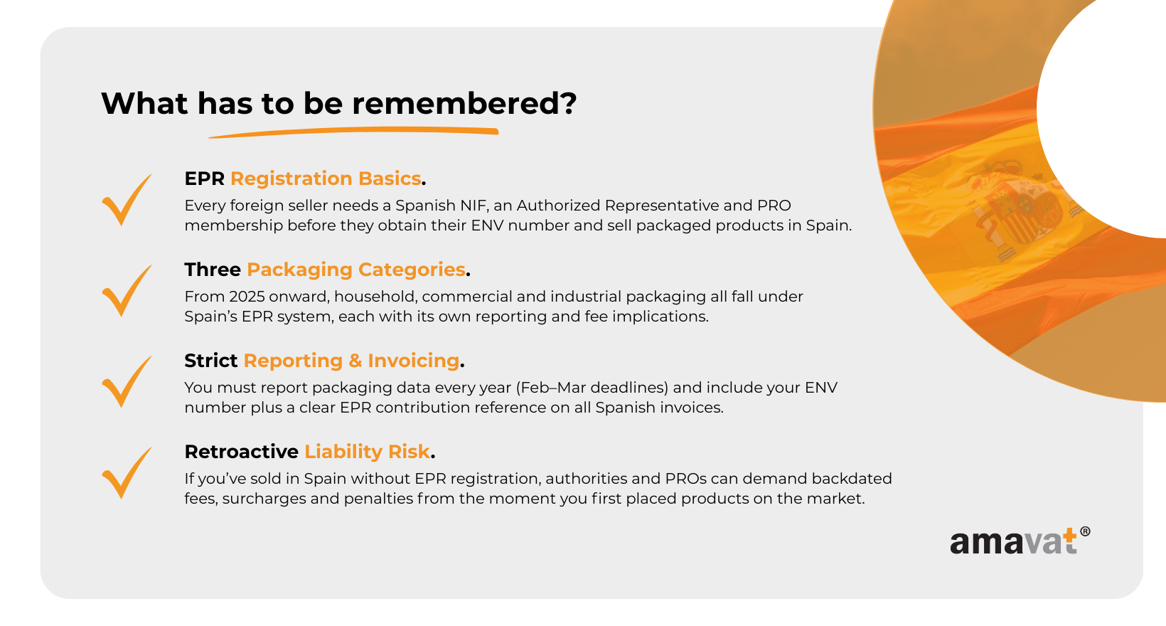 The first step is simply getting into the system. If you’re selling into Spain without registration, make the essentials your priority: get your Spanish NIF, appoint an Authorized Representative and join the PRO or PROs that match your packaging materials. Those three steps unlock your ENV number, which you’ll use in reporting, in invoicing and in platform compliance checks. If you’ve already registered for packaging, this is a good moment to make sure your registrations actually match what you sell — including any obligations for electronics or battery-powered products. Many sellers discover they’re fully covered for packaging but still missing WEEE or battery registration, especially if their catalogue has gradually expanded into tech or gadgets.